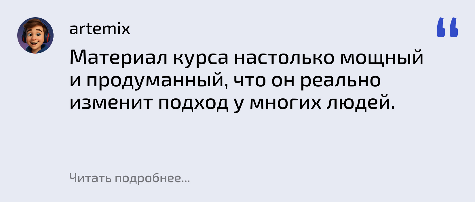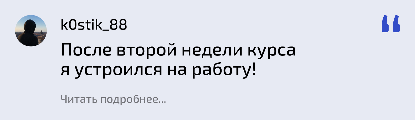 Уже после второй недели обучения я устроился на работу! Спасибо всей команде и сообществу.