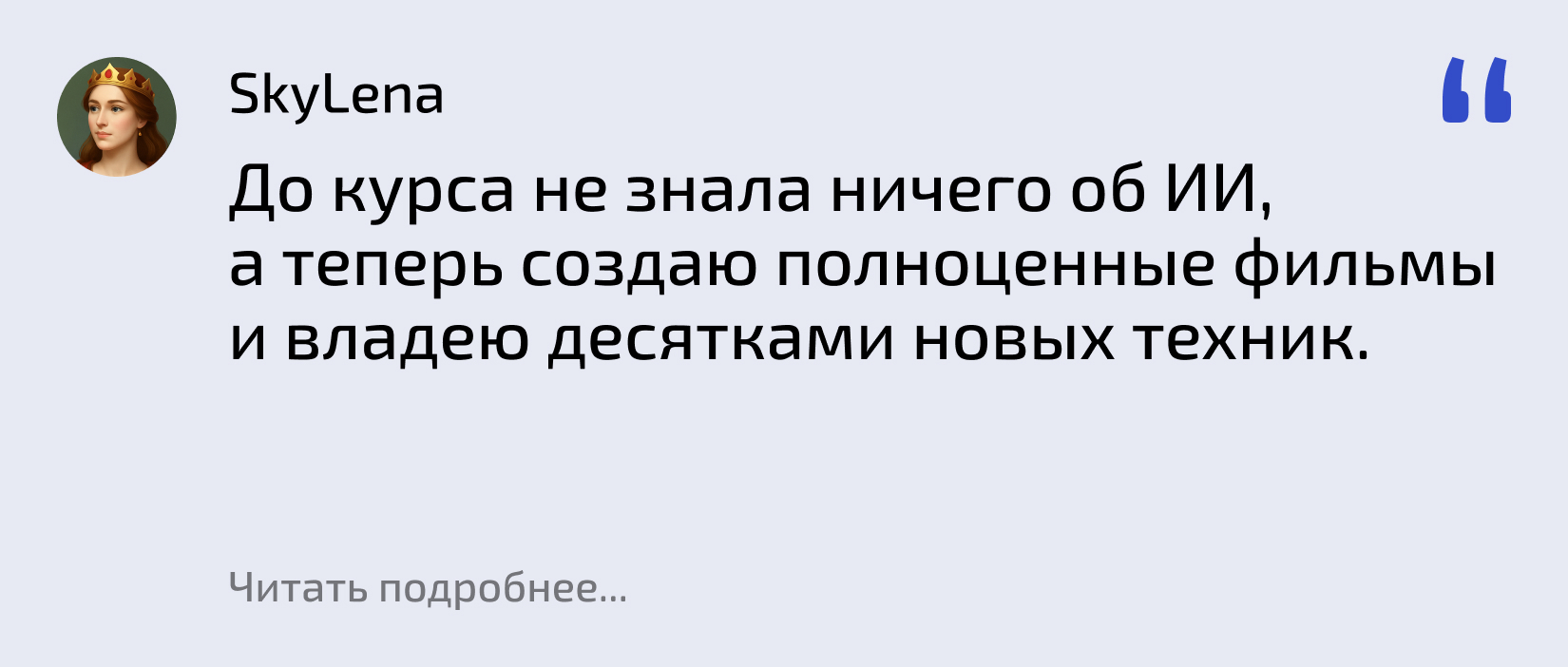 До курса я ничего не знала об ИИ, только видела посты в соцсетях. Сегодня я уже собрала полноценные фильмы на ИИ и освоила десятки новых инструментов. Это колоссальный рывок вперёд. Спасибо за мотивацию и поддержку!