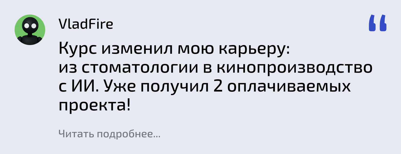 Огромное спасибо всей команде за то, что запустили меня в мир кинопроизводства с ИИ! 🚀 Полгода назад я начал первый курс и даже не думал, что смогу получить оплачиваемые проекты. Сейчас у меня их уже два. Курс полностью изменил мою жизнь: я ушёл из медицины и строю карьеру в кино с ИИ. Это дало новые горизонты, новые знания и огромное вдохновение. Спасибо за возможности и рост! ❤️