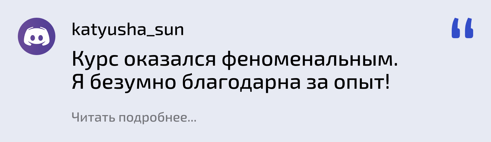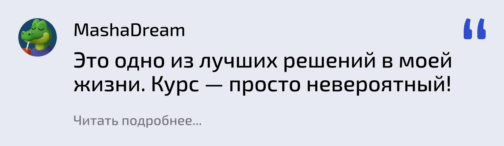 О Боже, это невероятно! Спасибо вам и всей вашей команде. Этот курс — реально одна из лучших вещей, что я сделала в жизни.