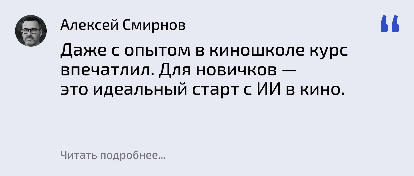 Спасибо огромное! То, как вы подали материал, было просто блестяще. Я учился в киношколе и уже имел опыт, но даже для меня это было открытием. А для новичков — вообще идеальный старт: сразу практика, сразу сторителлинг с инструментами ИИ. Вы реально мастера своего дела.